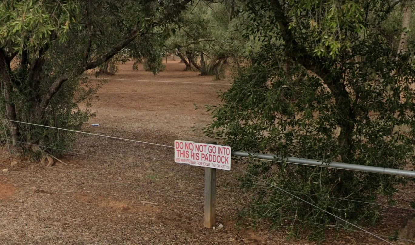 “Do Not Go Into this Paddock” - signage on the Police horse agistment paddock featuring a 160-year-old heritage-listed olive plantation in Kate Cocks Park (Park 27)