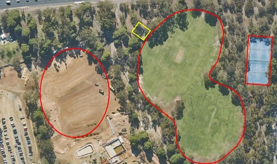 A new oval being laid immediately north of the new Aquatic Centre); the two eastern sports fields, and the tennis courts (all outlined in red) comprise the areas licenced to Blackfriars Priory College. Pic: Kadaltilla / Park Lands Authority.