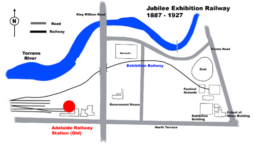 The line was built in 1887 from what was then the newly-established Adelaide Railway station, eastwards to the rear of the Jubilee Exhibition Building which stood on the corner of Frome Road and North Terrace on what is now part of the University of Adelaide.