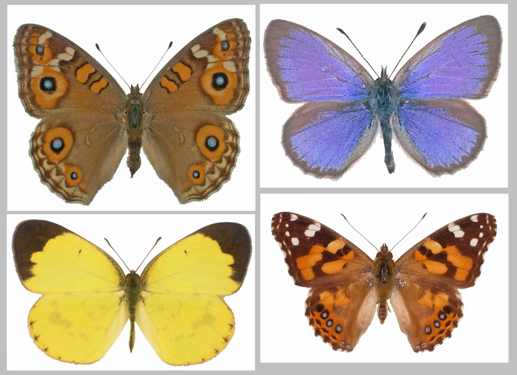Clockwise from top left: Meadow Argus, Junonia villida calybe; the Grass Blue (Zizena labradus), Painted Lady Vanessa-kershawi; and the Grass Yellow (Eurema smilax). Pics: Trevor Rowe / Roger Grund, Butterfly Conservation SA.