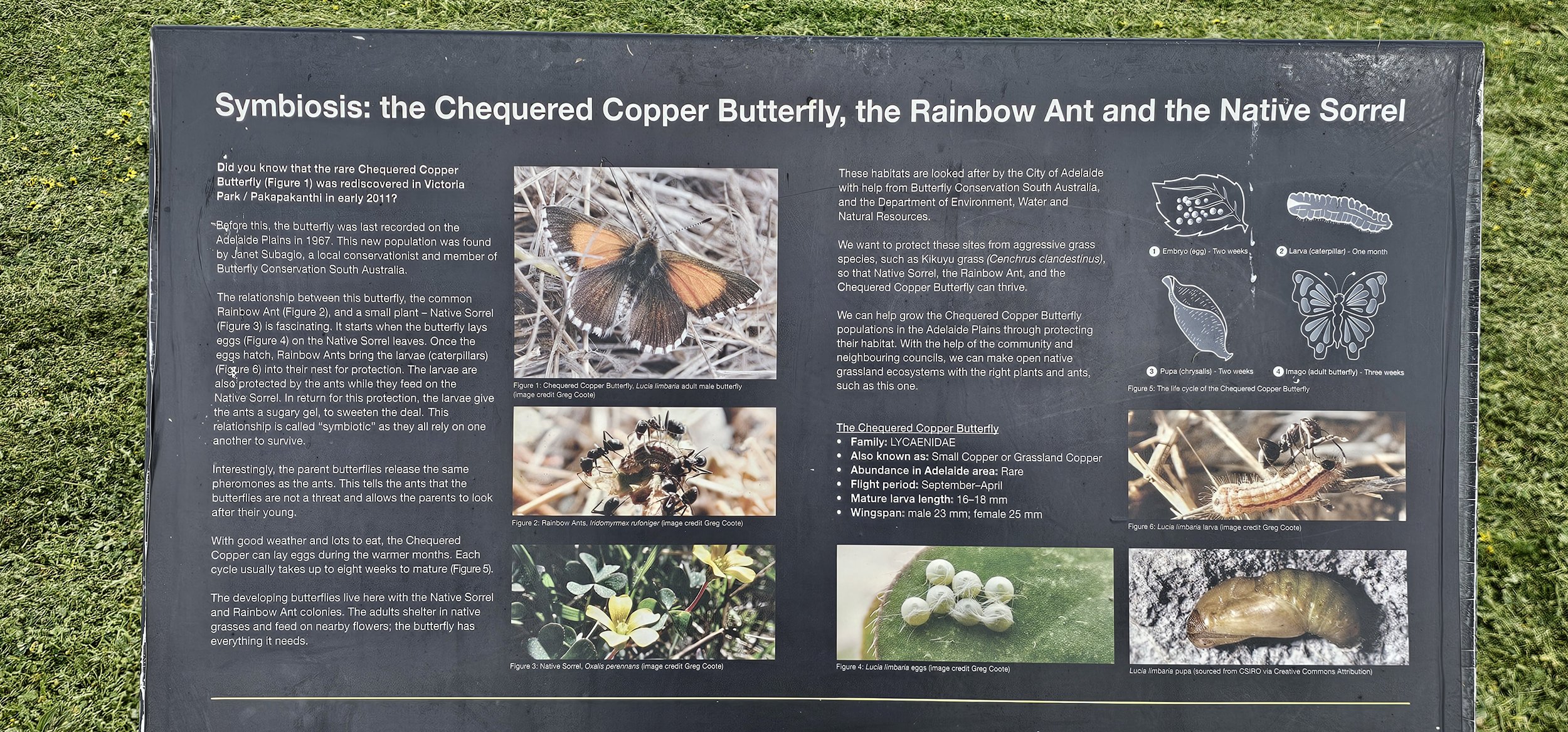 City of Adelaide sign in Victoria Park / Pakapakanthi (Park 16) explaining the life cycle of the Chequered Copper butterfly and its symbiotic relationship with Native Sorrel and the Rainbow Ant.