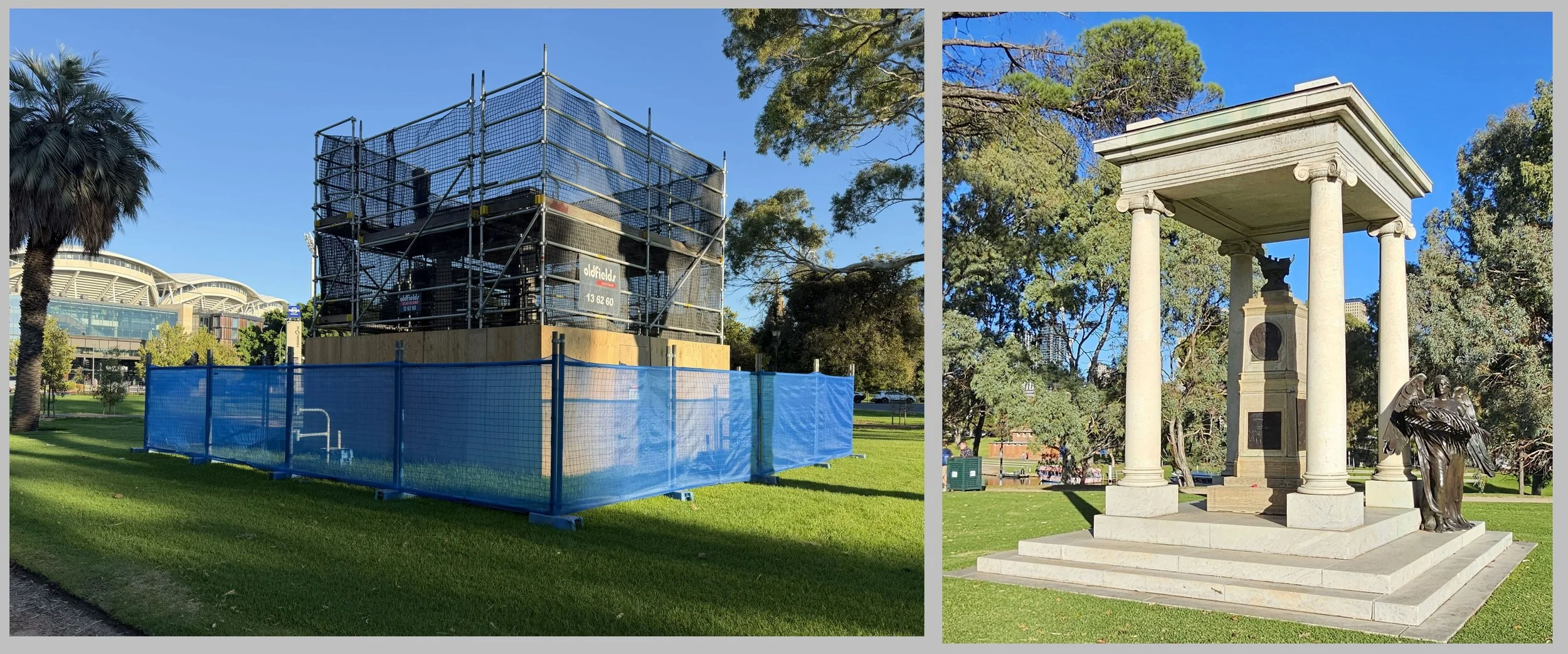 Pictured on 19 March 2026: the Angas memorial behind its temporary fence and scaffolding, and right; how it normally appears.
