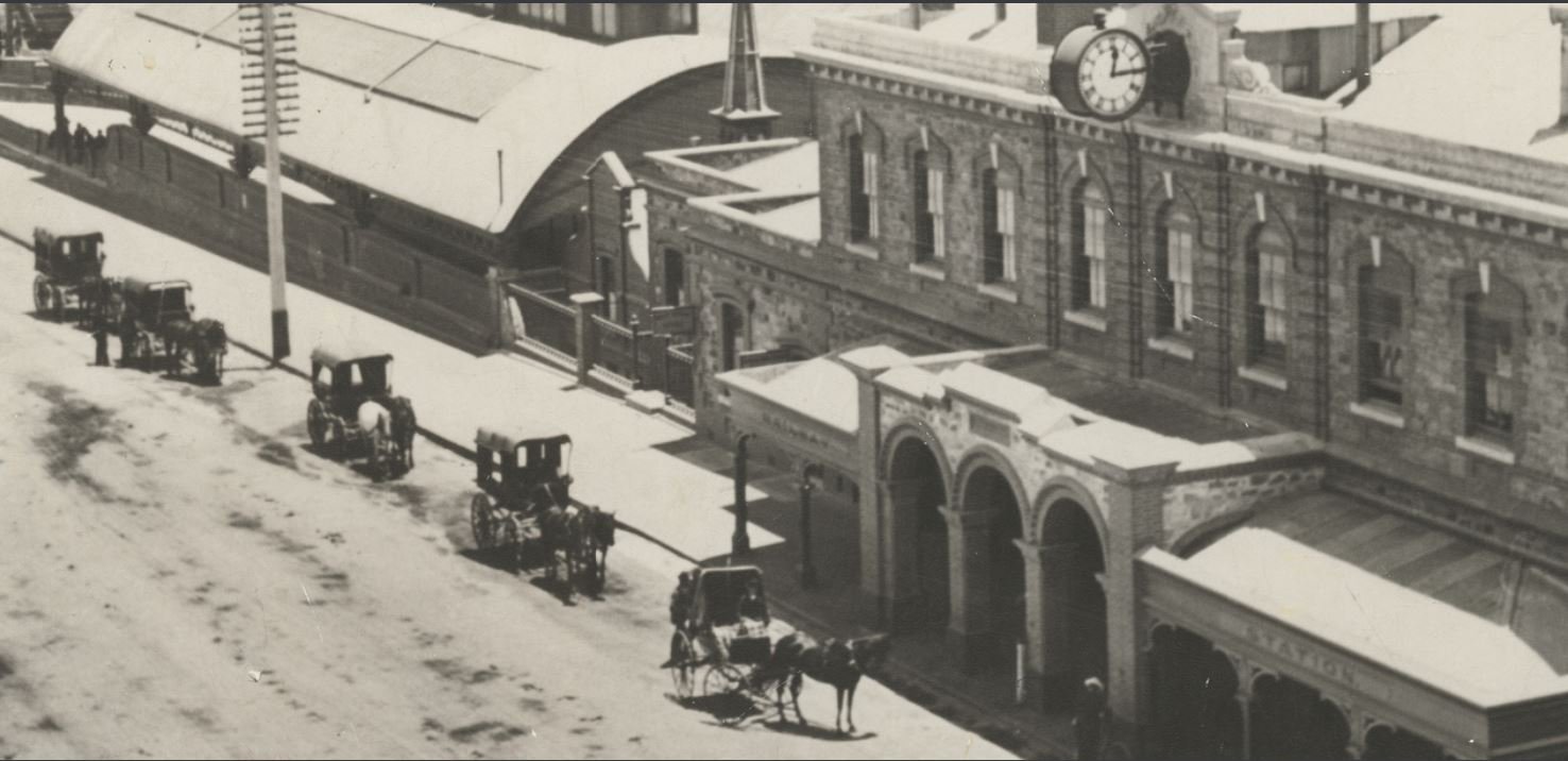 After much debate, the railway terminus was founded on this site on North Terrace. The first railway line, to Port Adelaide, opened in 1856. Over following decades, railway yards and lines spread further over both the northern and western Park Lands.