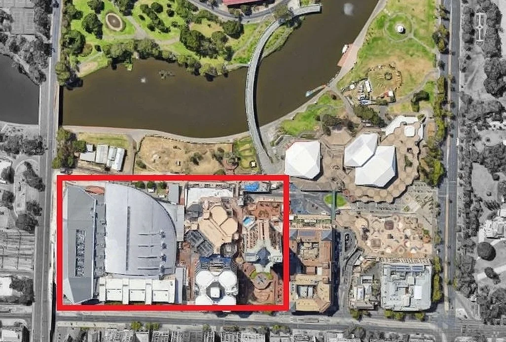 Most of the former Park Land between North Terrace and the River Torrens / Karrawirra Pari has been taken over by enormous commercial buildings, including: