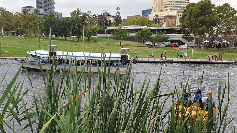 From here, walk past the casino hotel and stop at the entrance to a wide footbridge over the River Torrens / Karrawirra Pari.